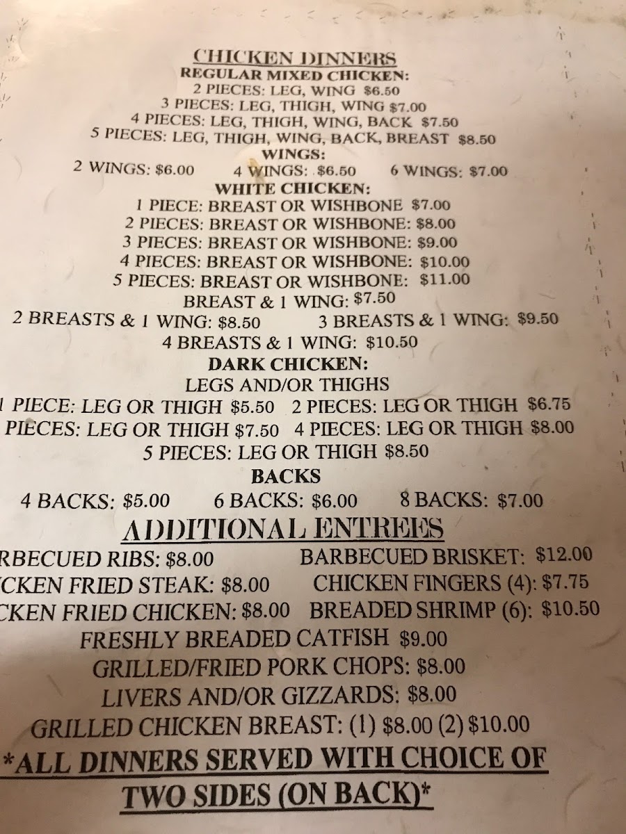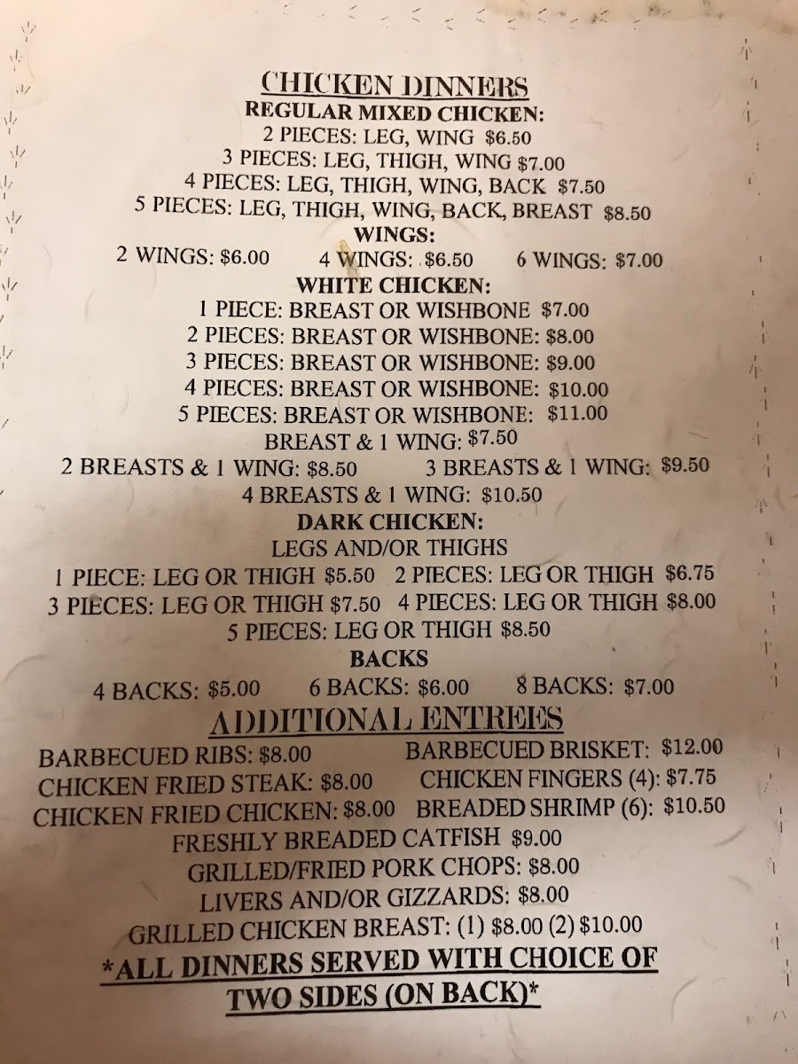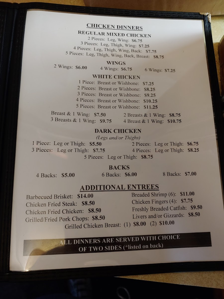 For a quick bite, Carry Outs are available, including Whole Chicken, Half Chicken, and 10 Backs-ideal for those on the go. If you're in the mood for something a bit more casual, Corn Dog W/Fries and 2 Piece Chicken Fingers are also on the menu.