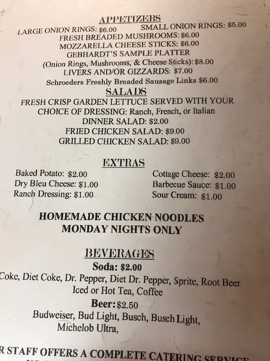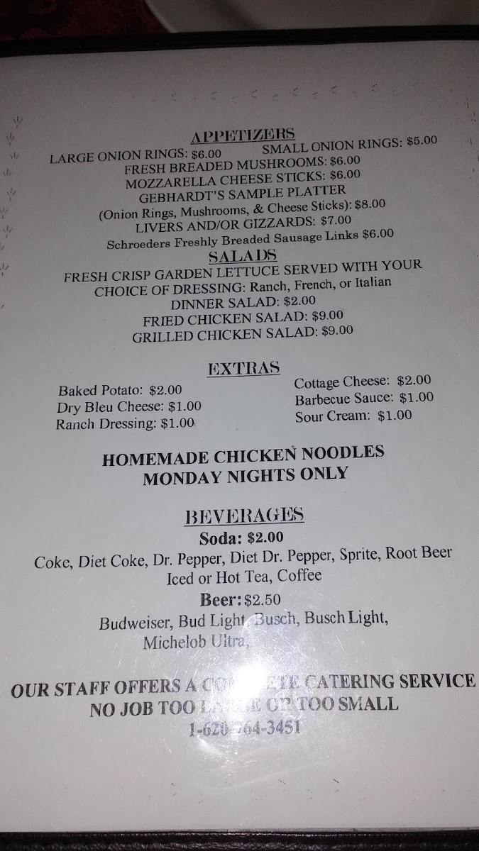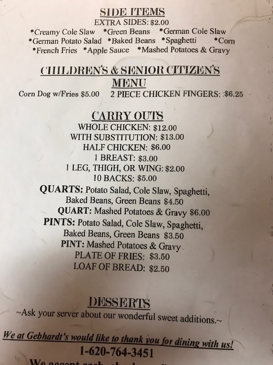 In conclusion, Gebhardt's Chicken Dinners offers a menu full of comforting favorites, from crispy appetizers to filling entrees, all served with a range of flavorful sides. Whether you're stopping in for a quick meal or enjoying a full dinner, there’s something for everyone at this inviting Kansas restaurant.